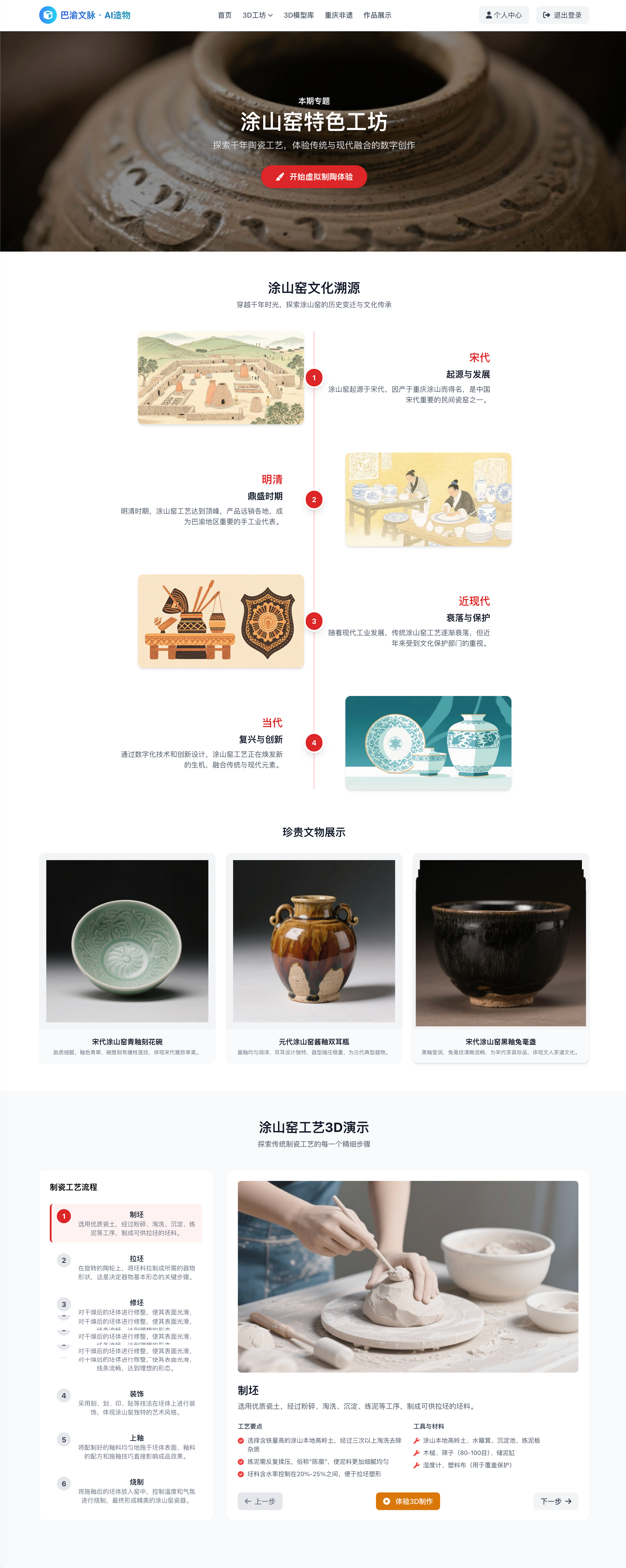基于 React + Three.js 构建 Web 端 3D 互动平台(B/S 架构),通过 Nginx 部署上线。设计"认知-体验-创造"渐进式产品框架,集成文生3D、图生3D等低门槛创作工具。用户停留时长提升 40%,并获得创新发明专利。